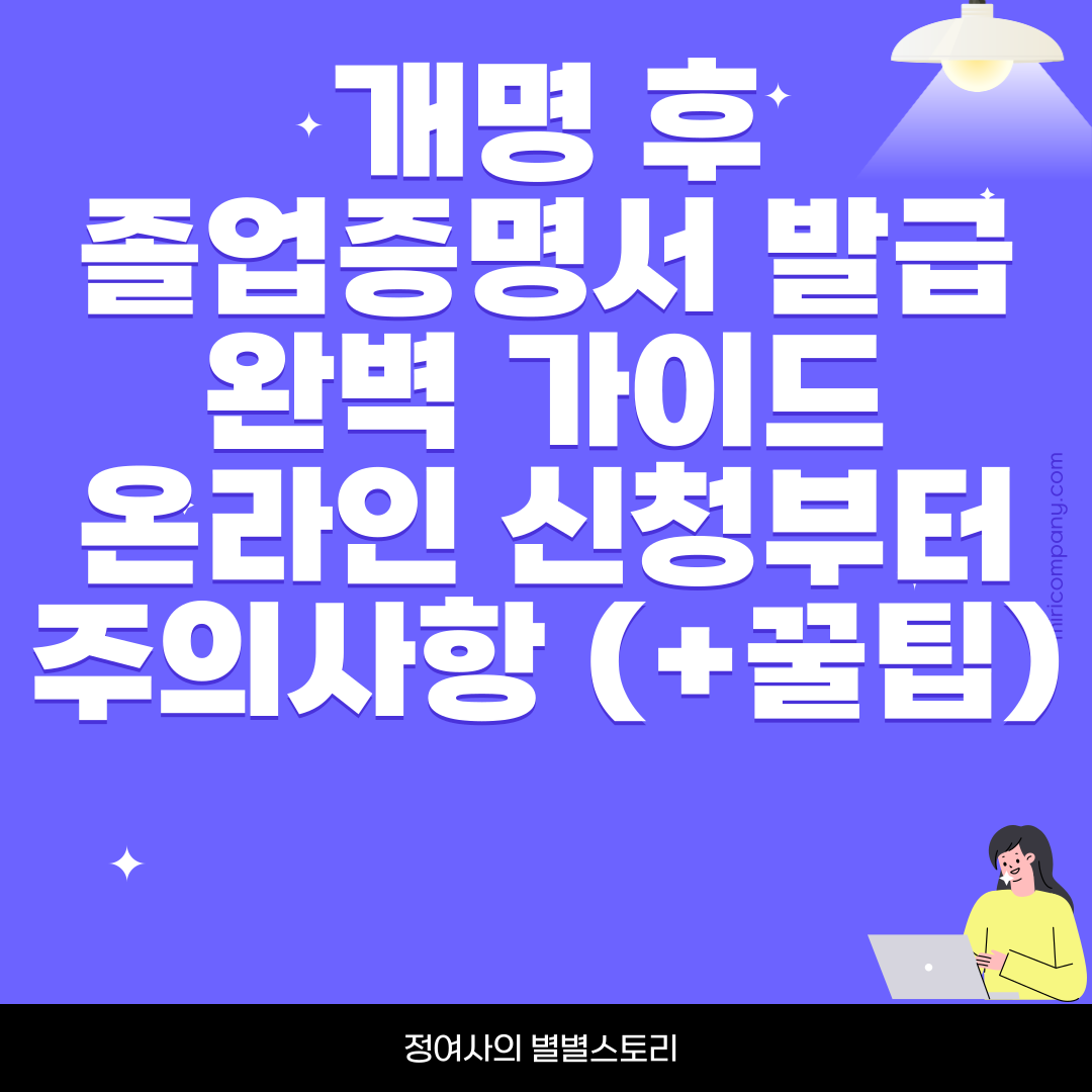 ์ƒˆ๋กœ์šด ์ด๋ฆ„์œผ๋กœ ๋ฉ‹์ง„ ์ถœ๋ฐœ์„ ์ค€๋น„ํ•˜๊ณ  ๊ณ„์‹ ๊ฐ€์š”? ๊ฐœ๋ช… ํ›„ ์กธ์—…์ฆ๋ช…์„œ ๋ฐœ๊ธ‰, ์ฒ˜์Œ์—๋Š” ๋ณต์žกํ•˜๊ฒŒ ๋А๊ปด์งˆ ์ˆ˜ ์žˆ์ง€๋งŒ, ๊ฑฑ์ •ํ•˜์ง€ ๋งˆ์„ธ์š”! ์ด ๊ธ€์—์„œ๋Š” ๊ฐœ๋ช… ํ›„ ์กธ์—…์ฆ๋ช…์„œ๋ฅผ ๋ฐœ๊ธ‰๋ฐ›๋Š” ๋ชจ๋“  ๊ณผ์ •์„ ์‰ฝ๊ณ  ์ž์„ธํ•˜๊ฒŒ ์•ˆ๋‚ดํ•ด ๋“œ๋ฆด๊ฒŒ์š”.
