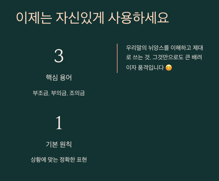 ์๋ ํ์ธ์, ์ฌ๋ฌ๋ถ. ์ง๋ ์ฃผ๋ง์ ์น๊ตฌ์ ๊ฒฐํผ์๊ณผ ์ง์ธ์ ์ฅ๋ก์์ ์ฐ๋ฌ์ ๋ค๋ ์ค๋ฉด์ ๋ฌธ๋ ์ด๋ฐ ์๊ฐ์ด ๋ค์์ด์. ์ฐ๋ฆฌ๊ฐ ํํ ์ฐ๋ '๋ถ์กฐ๊ธ', '์กฐ์๊ธ', '๋ถ์๊ธ'์ด๋ผ๋ ๋ง์ด ์ ํํ ์ด๋ป๊ฒ ๋ค๋ฅด๊ณ ์ธ์ ์ด๋ค ํํ์ ์จ์ผ ํ๋ ๊ฑธ๊น? ์ฌ์ค ์ ๋ ๋งค๋ฒ ๊ณ ๋ฏผํ๊ฑฐ๋ ์. ๊ทธ๋์ ์ด๋ฒ ๊ธฐํ์ ํ์คํ ์ ๋ฆฌํด๋ดค์ต๋๋ค. ์ ์ฒ๋ผ ํท๊ฐ๋ ธ๋ ๋ถ๋ค๊ป ๋์์ด ๋๊ธธ ๋ฐ๋ผ๋ฉฐ, ์ค๋์ ๊ทธ ๋ฏธ๋ฌํ์ง๋ง ์ค์ํ ์ฐจ์ด์ ๋ํด ์ด์ผ๊ธฐํด๋ณด๋ ค๊ณ ํด์.